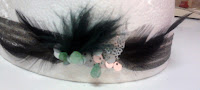 Adriana me ha enviado una foto con su diadema también de malla, encaje, cristal, jade y plumas de gallo negro.